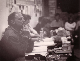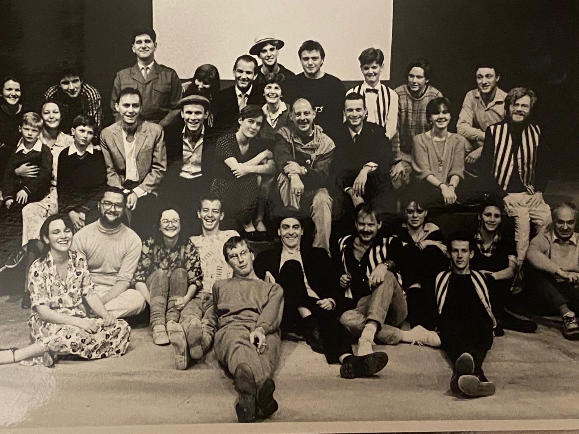 IMAGES L-R: Frank Barnes in typical pose watching On the Wallaby rehearsals in the Jean Blue Room, 1986, Frank and On the Wallaby cast and crew, 1986.